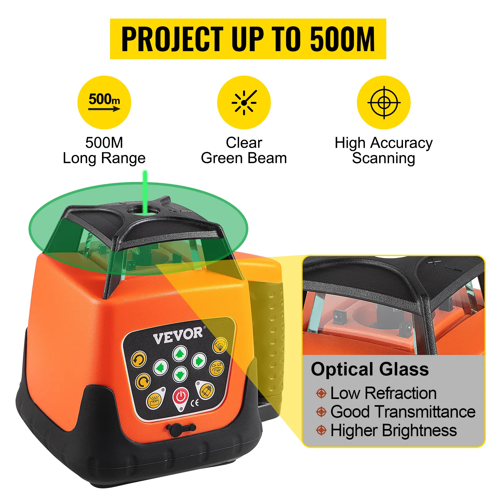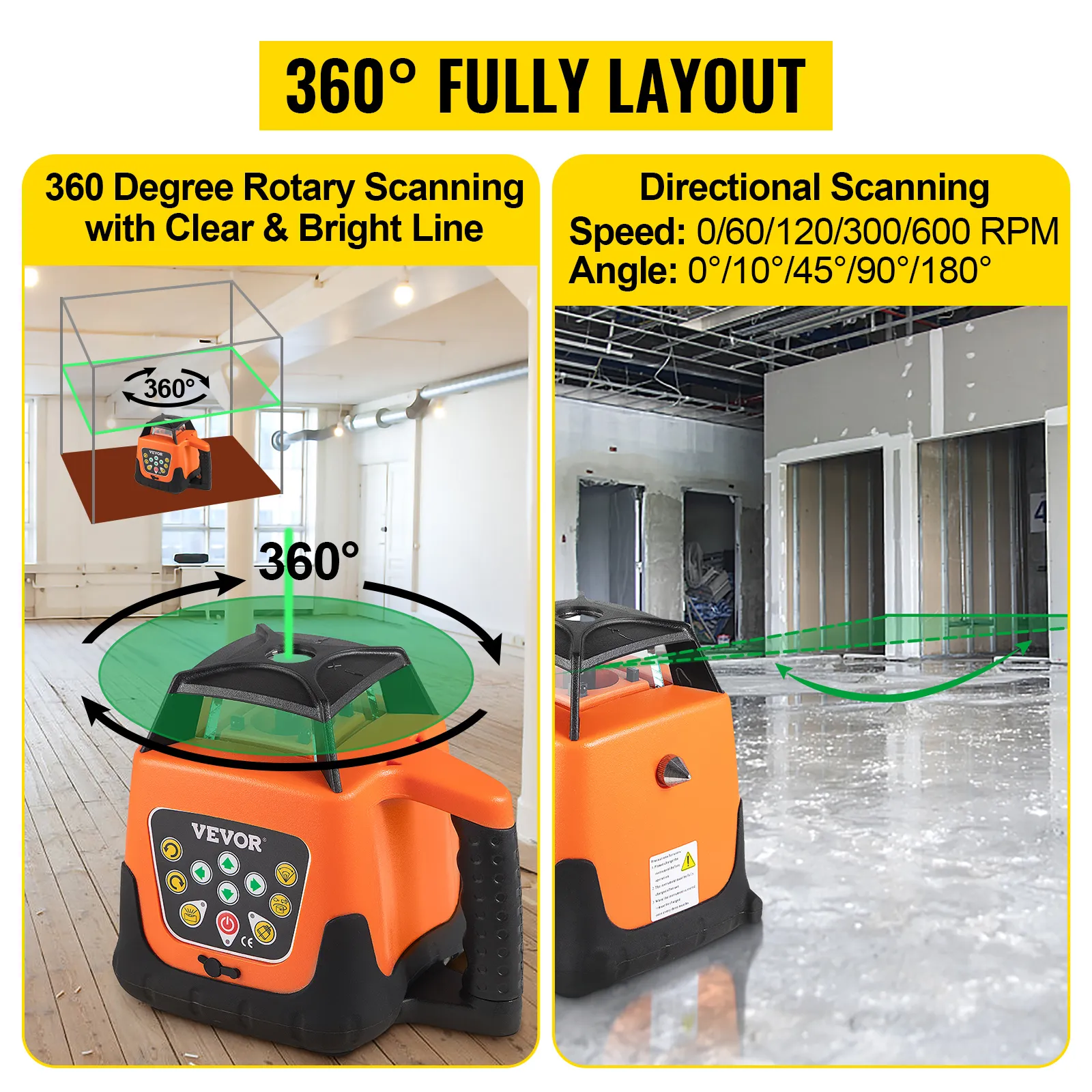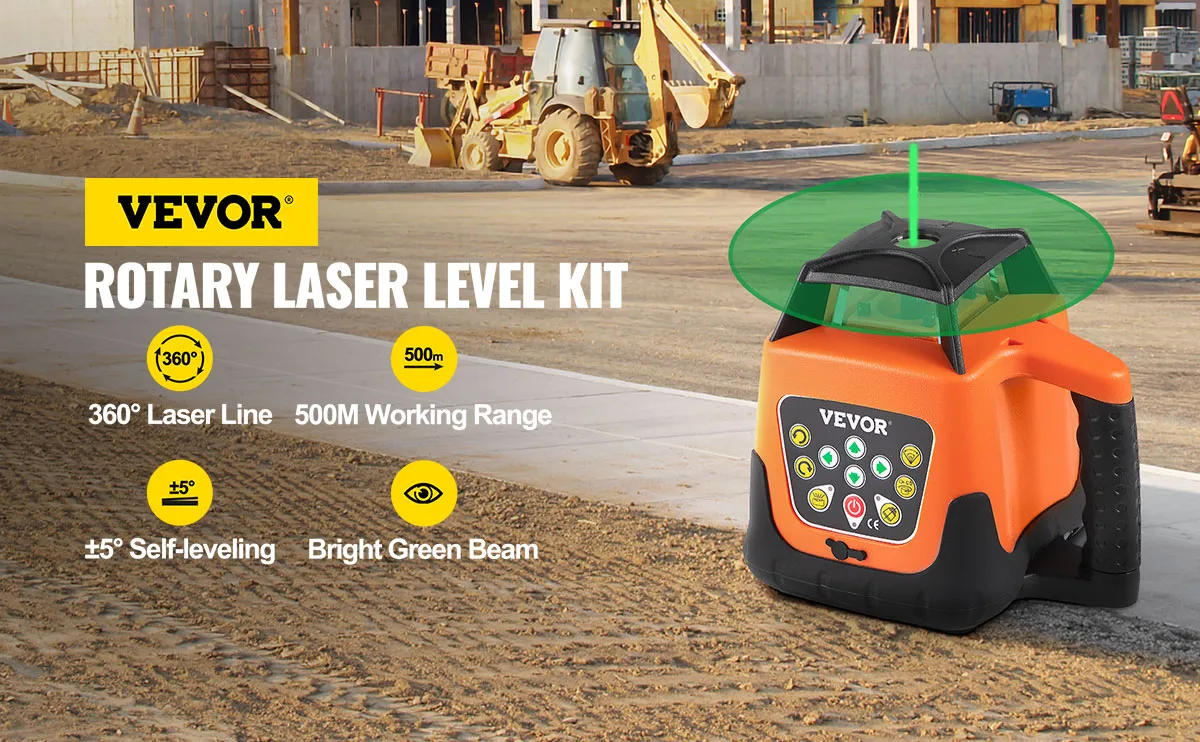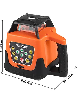 De roterende laserwaterpas heeft een groot bereik; zendt heldergroene stralen uit, met een werkbereik tot 1640ft in diameter (met de laserontvanger). Het 360-graden roterende ontwerp biedt volledige dekking van de werkplek. Snelle en gemakkelijke uitlijning verbetert de nauwkeurigheid en productiviteit op de werklocatie. Het wordt veel gebruikt in bouwprojecten, installatie van grote apparatuur, kamerdecoratie, enz.