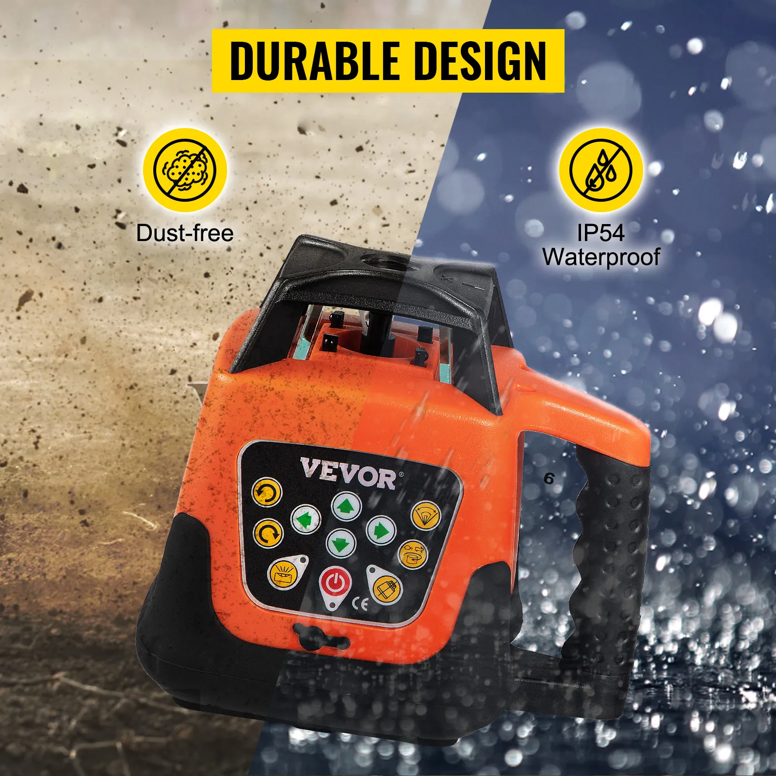 Deze zelfnivellerende roterende laser is gemaakt van stevig plastic, heeft een robuust ontwerp en heeft een IP54 water- en stofdichtheid. Bovendien zorgt de lange batterijduur voor bijna 25 uur continu gebruik.