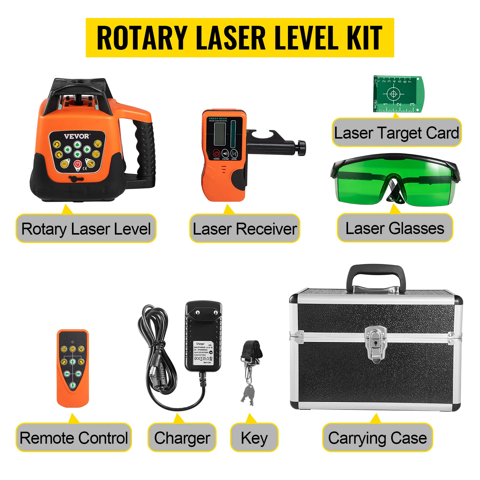Inclusief een volledige set accessoires: roterende laserwaterpas, laserontvanger, laserbril, doelkaart, afstandsbediening en oplader; wordt geleverd in een stevige draagtas voor eenvoudige opslag en draagbaarheid.