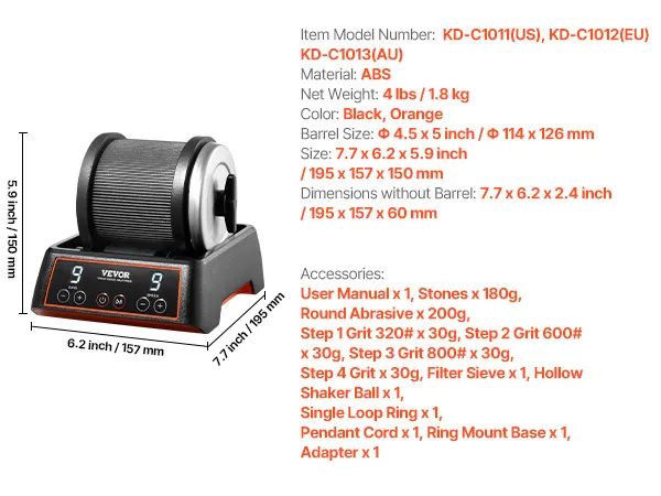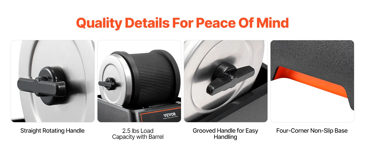 Smart Safety Design: The stone tumbler features an upgraded curved lid design for easy and hand-secure twisting. The high-seal chamber prevents water leakage and keeps your workspace clean. It also features a grooved handle for easy lifting and anti-slip pads to keep the machine stable during powerful operation.