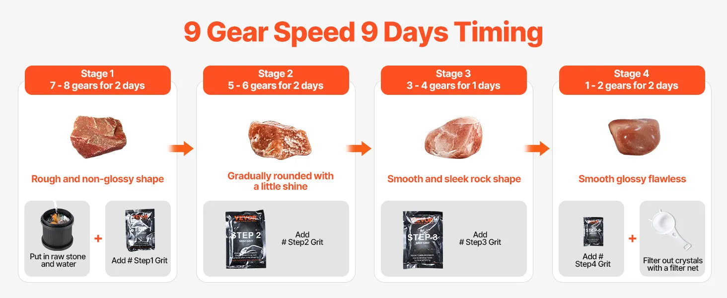 Choose from 9 precise speed settings tailored for each tumbling stage, with a timer extending up to 9 days. Simply set the stone tumbler and let it work, freeing up your time for other activities.