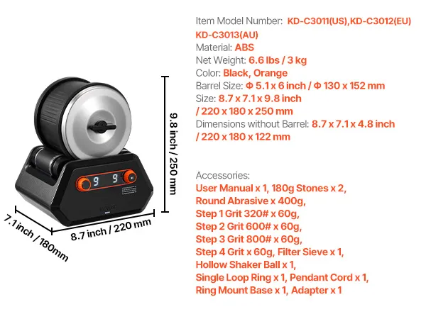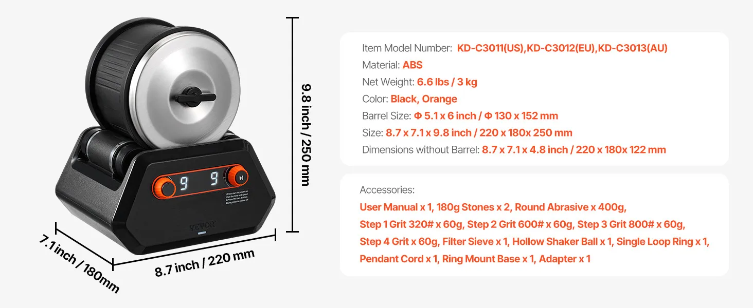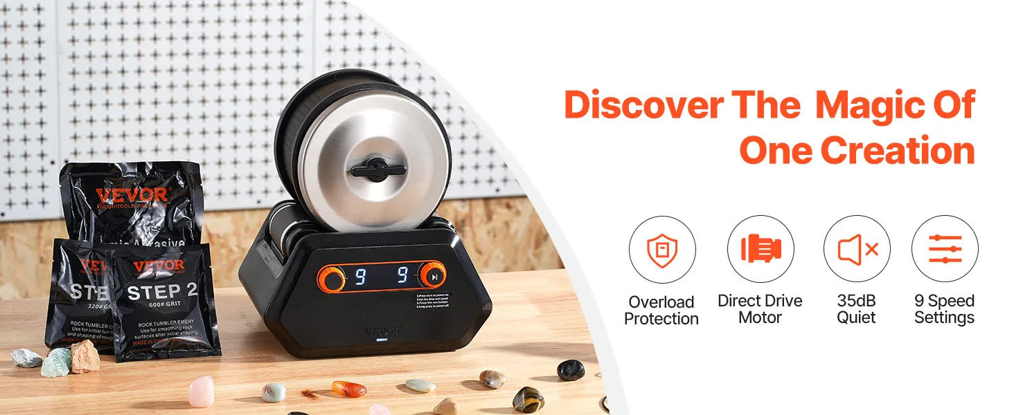 VEVOR Steenpolijstset Steenpolijstmachine 1,81 kg Capaciteit 9 Snelheidsniveaus, 9-daagse polijsttimer, Steenslijper met grove edelstenen en polijstkorrels, Steenpolijstmachine Zwart & Oranje