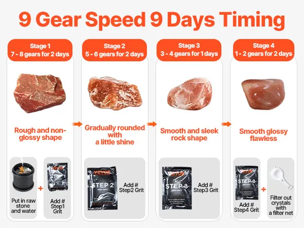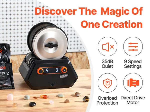 Verbeterde 9-snelheidsregeling: deze steenpolijstset beschikt over een gebruiksvriendelijk bedieningspaneel waarmee u kunt kiezen tussen 1-9 snelheden en een timer van 1-9 dagen. Of je nu een 8-jarige beginner bent of een fervent stenenverzamelaar, je polijst moeiteloos edelstenen en maakt kunstwerken die vergelijkbaar zijn met die van een meester.