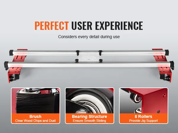 User-Friendly Features: We've thought of everything! With built-in brushes to keep wood chips and dust at bay, upgraded roller bearings for smoother movement, and 8 rollers for effortless support, our router table sled is designed with your convenience in mind. Say hello to hassle-free woodworking!