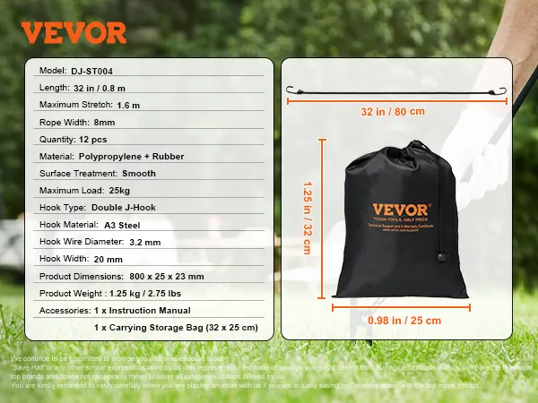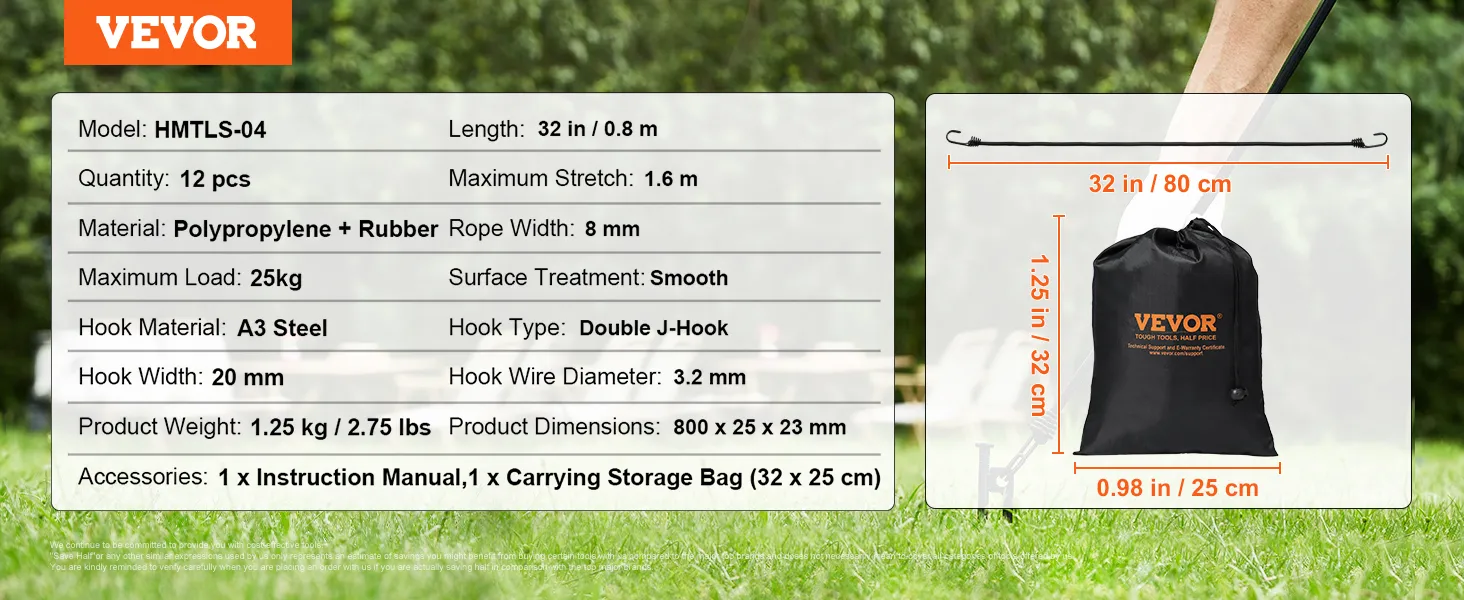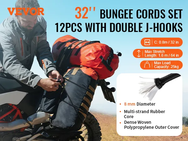 VEVOR 12-delige bungee-koordset met A3 stalen haken, 81,3 cm zware spanbanden, 8 mm elastische bungee-koordset voor kamperen, zeilen, motorfiets, vrachtwagen en tent, zwart