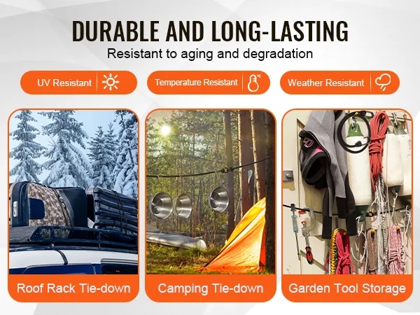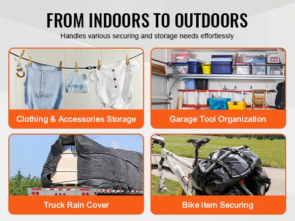 Veelzijdigheid: deze bungeeriemen zijn geschikt voor thuisorganisatie, buitenavonturen of logistiek. Ze kunnen elke taak gemakkelijk aan en voldoen aan talloze behoeften voor het beveiligen of opbergen van spullen.