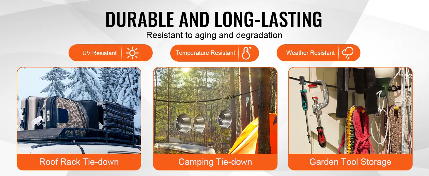 Duurzaamheid: Uitstekende weerbestendigheid zorgt ervoor dat deze heavy-duty bungeekoorden stabiele prestaties behouden, zelfs onder extreme omstandigheden, of het nu hoge temperaturen, vriestemperaturen, vochtigheid of droogte zijn, zonder te verouderen of gemakkelijk te breken.