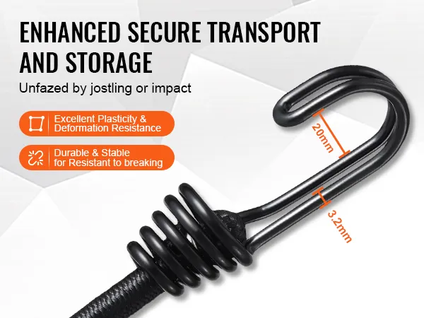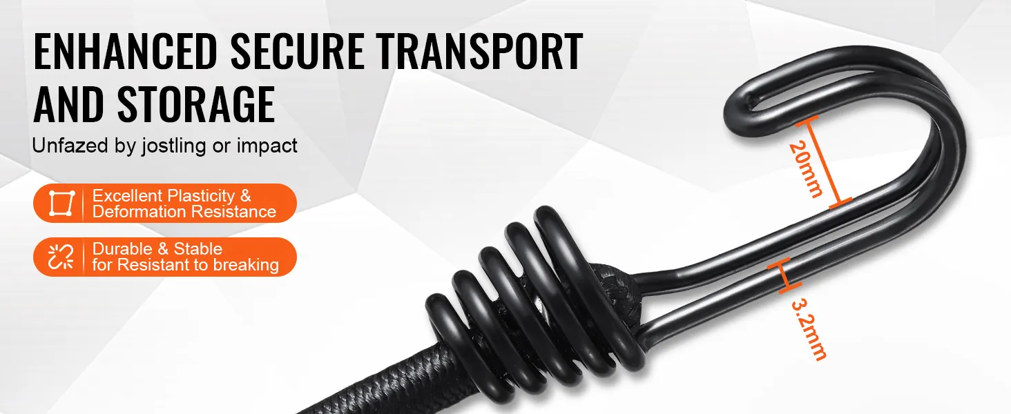 Stabiliteit: De zeer sterke, slijtvaste haken van deze bungeekoordsets zorgen voor uitzonderlijke stabiliteit bij het vastzetten van voorwerpen. Zelfs tijdens transport of opslag kunnen schokken en trillingen uw lading niet losmaken of scheiden.