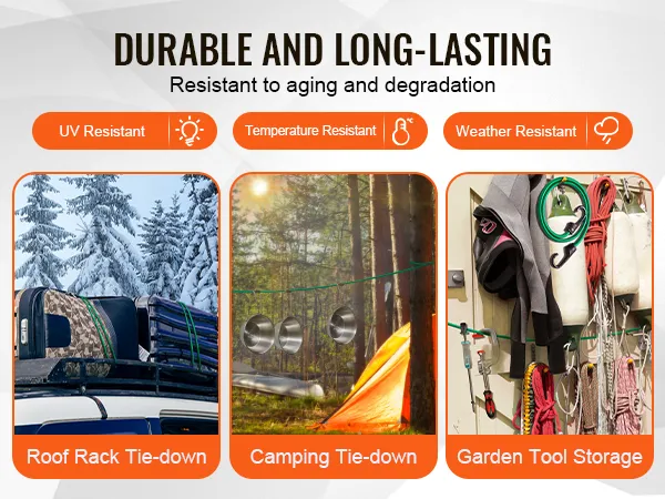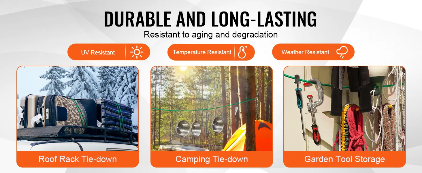 Durability: Outstanding weather resistance ensures that these heavy-duty bungee cords maintain stable performance in extreme conditions, whether high heat, freezing temperatures, humidity, or dryness, without aging or breaking easily.
