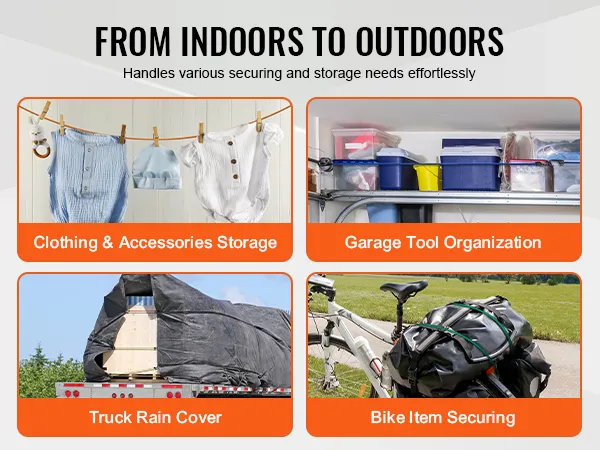 Adaptability: The high elasticity design of these bungee cords allows them to easily secure or store items of various shapes and sizes. Whether round, square, or irregular, they conform perfectly, enhancing convenience.