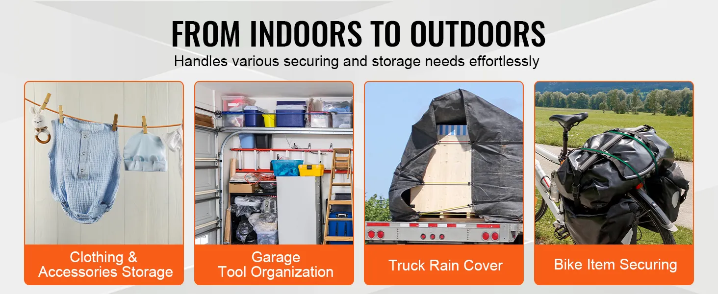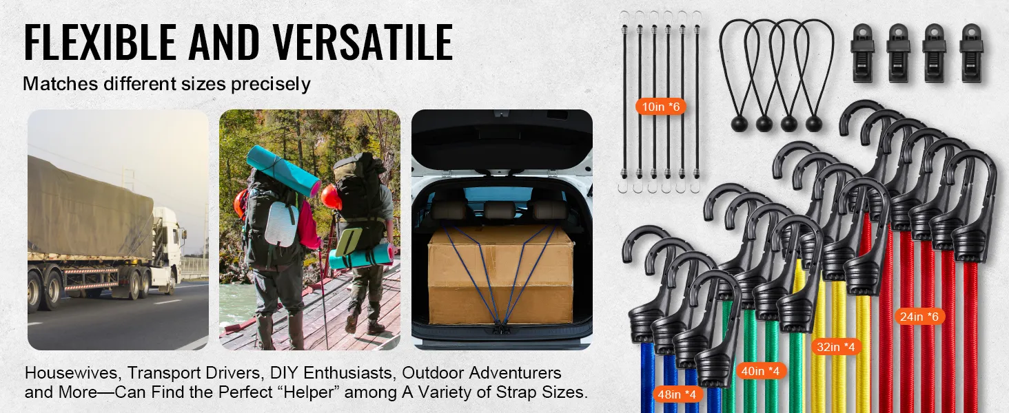 Versatility: Suitable for home organization, outdoor adventures, or logistics, these bungee straps easily handle any task, fulfilling a wide range of needs for securing or storing items.