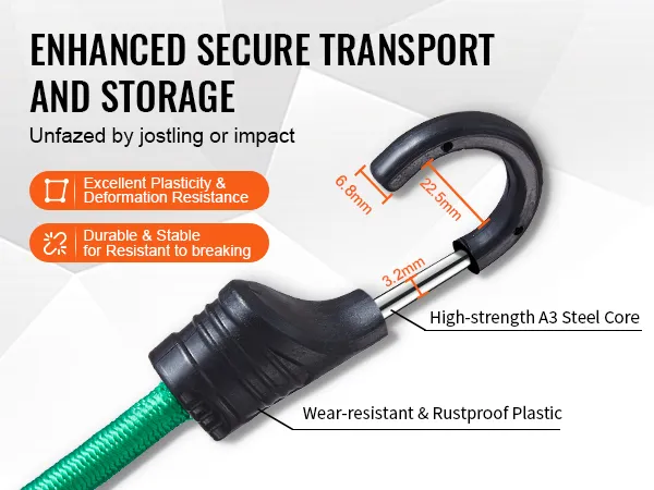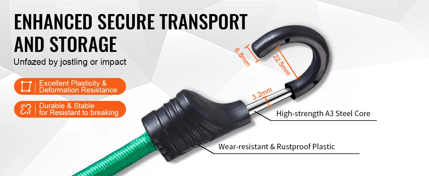 Designed for secure transport and storage, the high-strength hooks on these bungee cord sets resist deformation and breakage, providing extra safety by protecting items from bumps and impacts.