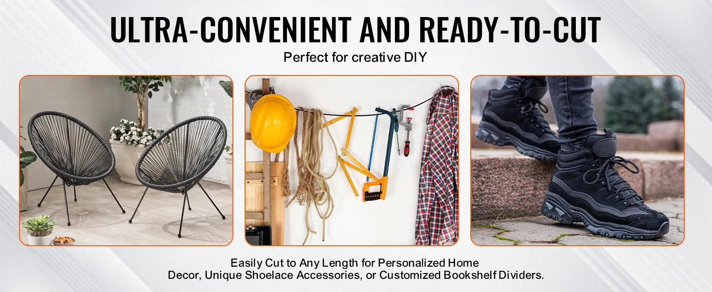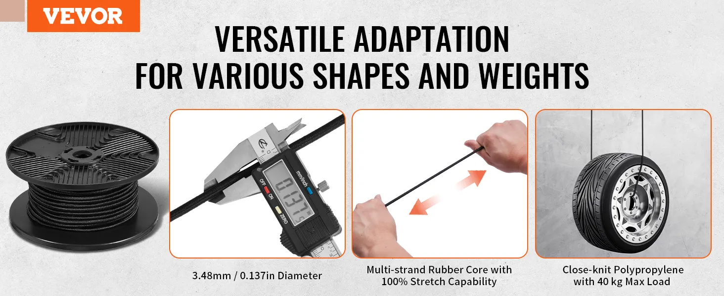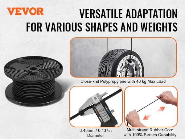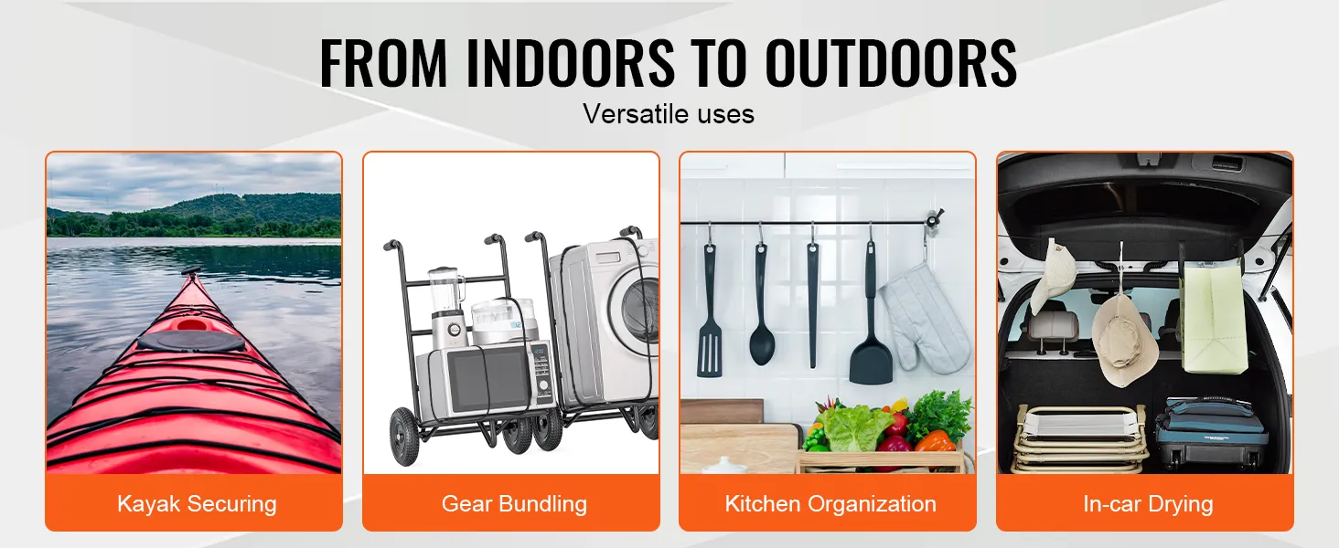 Op maat gesneden: deze bungeekoorden kunnen eenvoudig op de gewenste lengte worden geknipt. Of ze nu thuis worden georganiseerd of buitenshuis worden gebruikt, ze passen zich efficiënt aan, zorgen ervoor dat er geen middelen worden verspild en maken het leven gemakkelijker en netter.