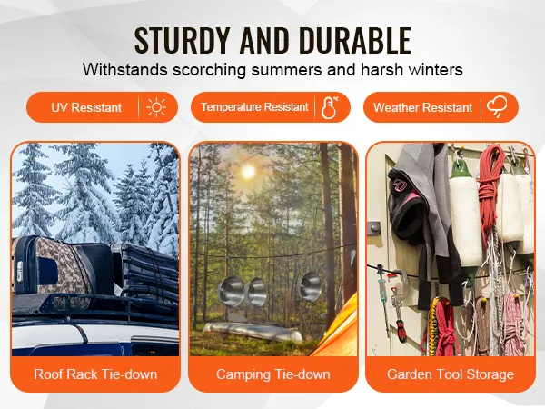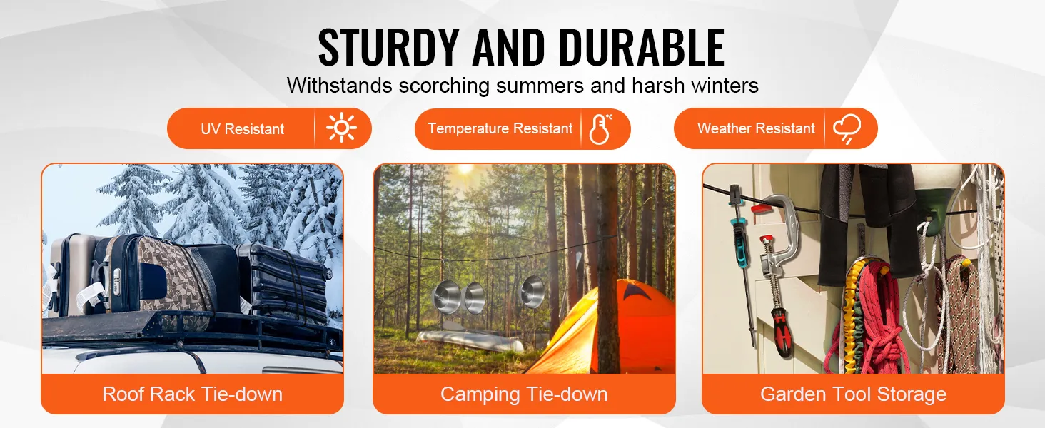 Duurzaamheid: Uitstekende weersbestendigheid zorgt ervoor dat deze heavy-duty bungeekoorden stabiele prestaties behouden, zelfs onder extreme omstandigheden, of het nu hoge hitte, vriestemperaturen, vochtigheid of droogte is, zonder te verouderen of gemakkelijk te breken.