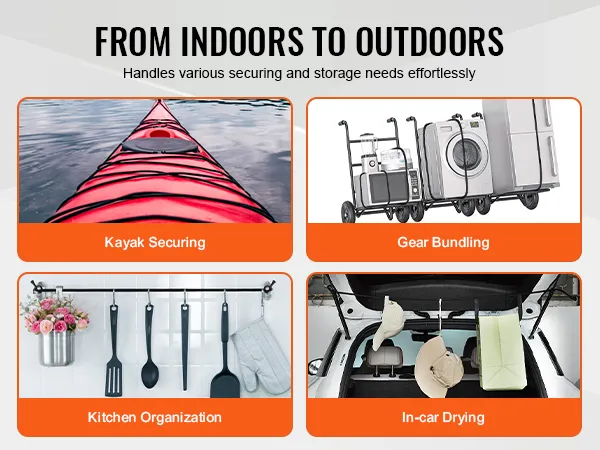 Veelzijdigheid: Of het nu voor binnen- of buitengebruik is, deze bungeekoorden zijn uitstekend in elke situatie. Of het nu gaat om het vastzetten van kajaks op het water, het aanspannen van uitrusting voor buitenavonturen of het organiseren van huishoudelijke spullen, ze kunnen het allemaal met gemak aan.