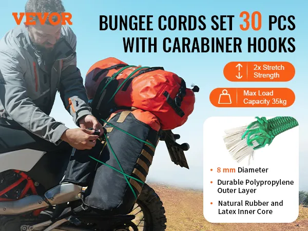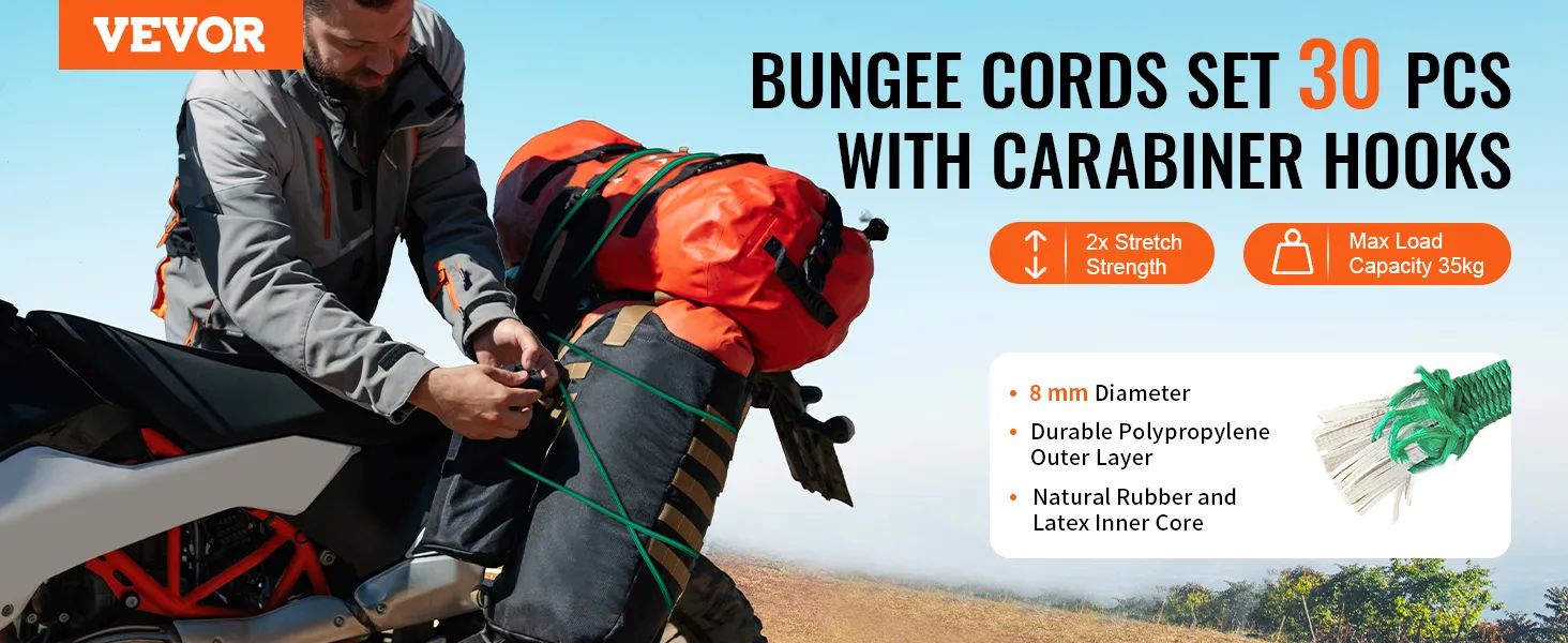 VEVOR 30 Piece Bungee Cords Assortment, 8 mm Heavy Duty Bungee Straps with A3 Steel Carabiners, Includes 10", 18", 24", 36", 48", 60", 72", Portable Storage Bag, 6 Clips & Canopy Ties VEVOR 30 Piece Bungee Cords Assortment, 8 mm Heavy Duty Bungee Straps with A3 Steel Carabiners, Includes 10", 18", 24", 36", 48", 60", 72", Portable Storage Bag, 6 Clips & Canopy Ties