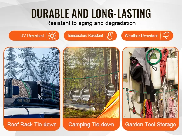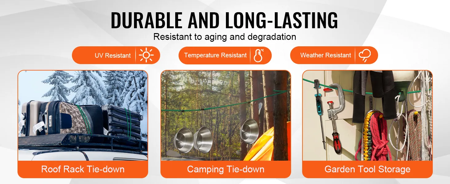 • Durability: Outstanding weather resistance ensures that these heavy-duty bungee cords maintain stable performance in extreme conditions, whether high heat, freezing temperatures, humidity, or dryness, without aging or breaking easily.