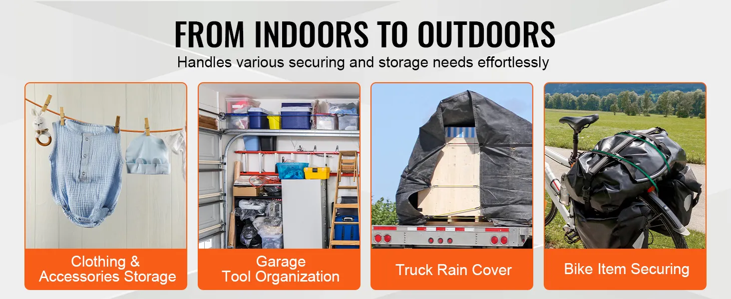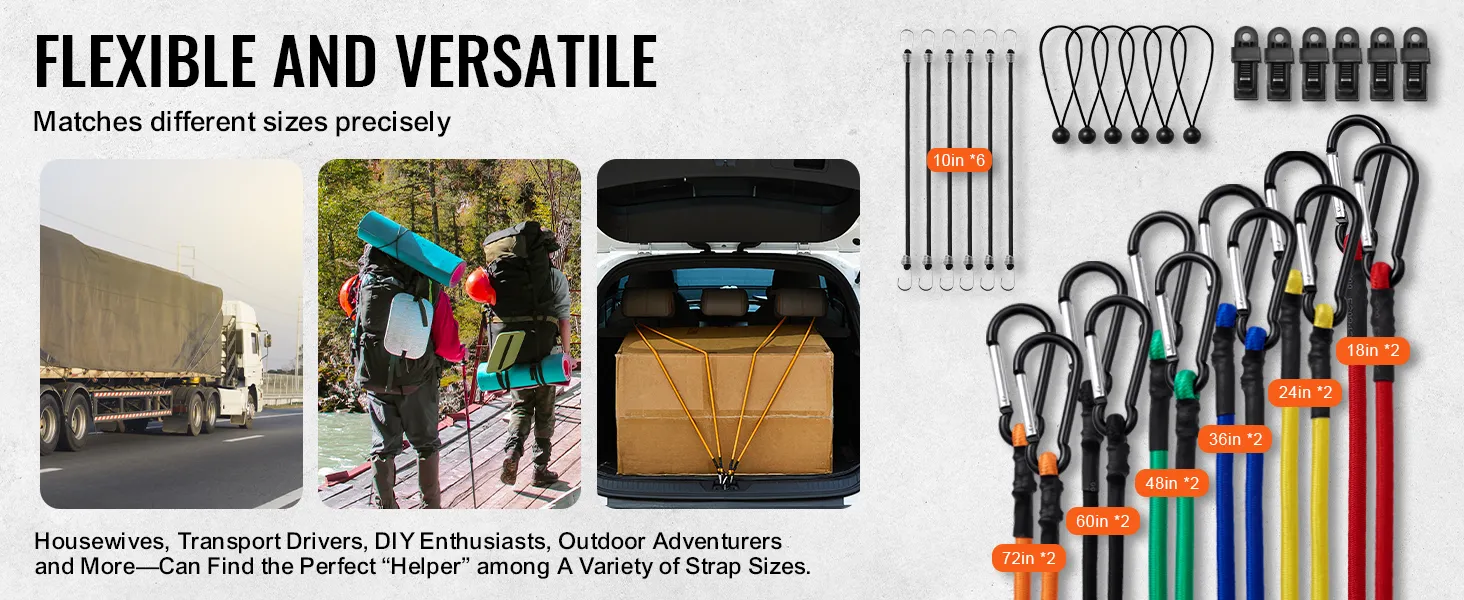 • Versatility: Suitable for home organization, outdoor adventures, or logistics, these bungee straps easily handle any task, fulfilling a wide range of needs for securing or storing items.