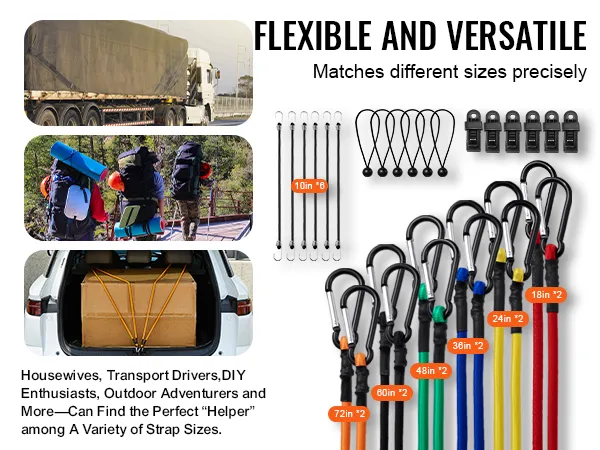 • Flexibility: With multiple size options available, these bungee ropes offer high flexibility. Whether for small, delicate items or large, heavy cargo, there's a suitable size for every need.