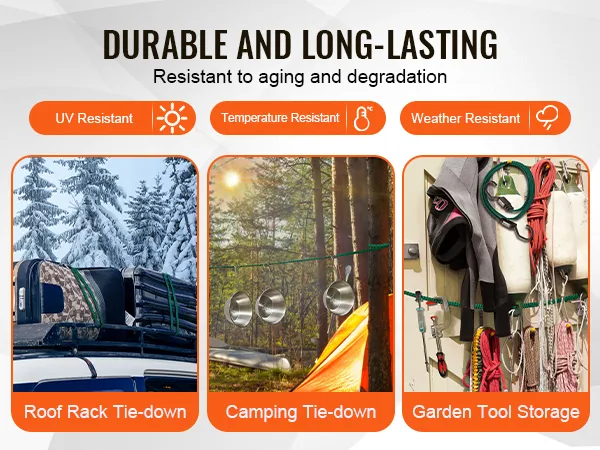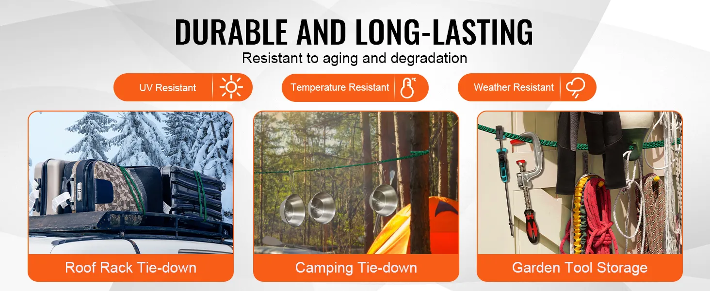 • Durability: Outstanding weather resistance ensures that these heavy-duty bungee cords maintain stable performance in extreme conditions, whether high heat, freezing temperatures, humidity, or dryness, without aging or breaking easily.