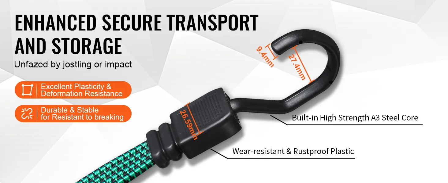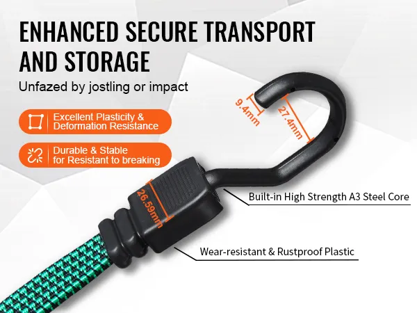 Designed for secure transport and storage, the high-strength hooks on these bungee cord sets resist deformation and breakage, providing extra safety by protecting items from bumps and impacts.