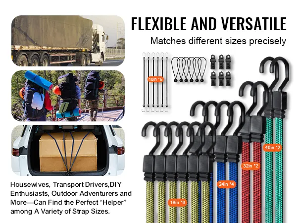 • Versatility: Suitable for home organization, outdoor adventures, or logistics, these bungee straps easily handle any task, fulfilling a wide range of needs for securing or storing items.