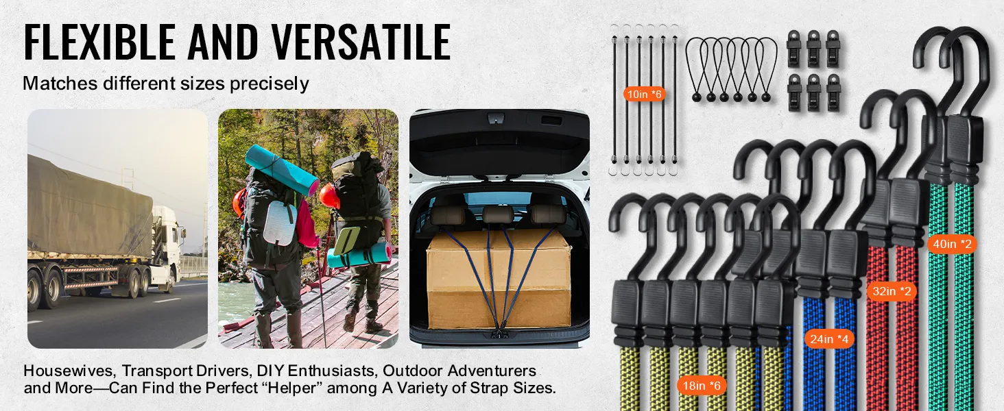 VEVOR 32 Piece Flat Bungee Cord Set, 17 mm Heavy Duty Bungee Straps with A3 Steel J-Hooks, Includes 10", 18", 24", 32", 40", Bungee Rope with Portable Storage Bag, 6 Clips & Canopy Ties VEVOR 32 Piece Flat Bungee Cord Set, 17 mm Heavy Duty Bungee Straps with A3 Steel J-Hooks, Includes 10", 18", 24", 32", 40", Bungee Rope with Portable Storage Bag, 6 Clips & Canopy Ties