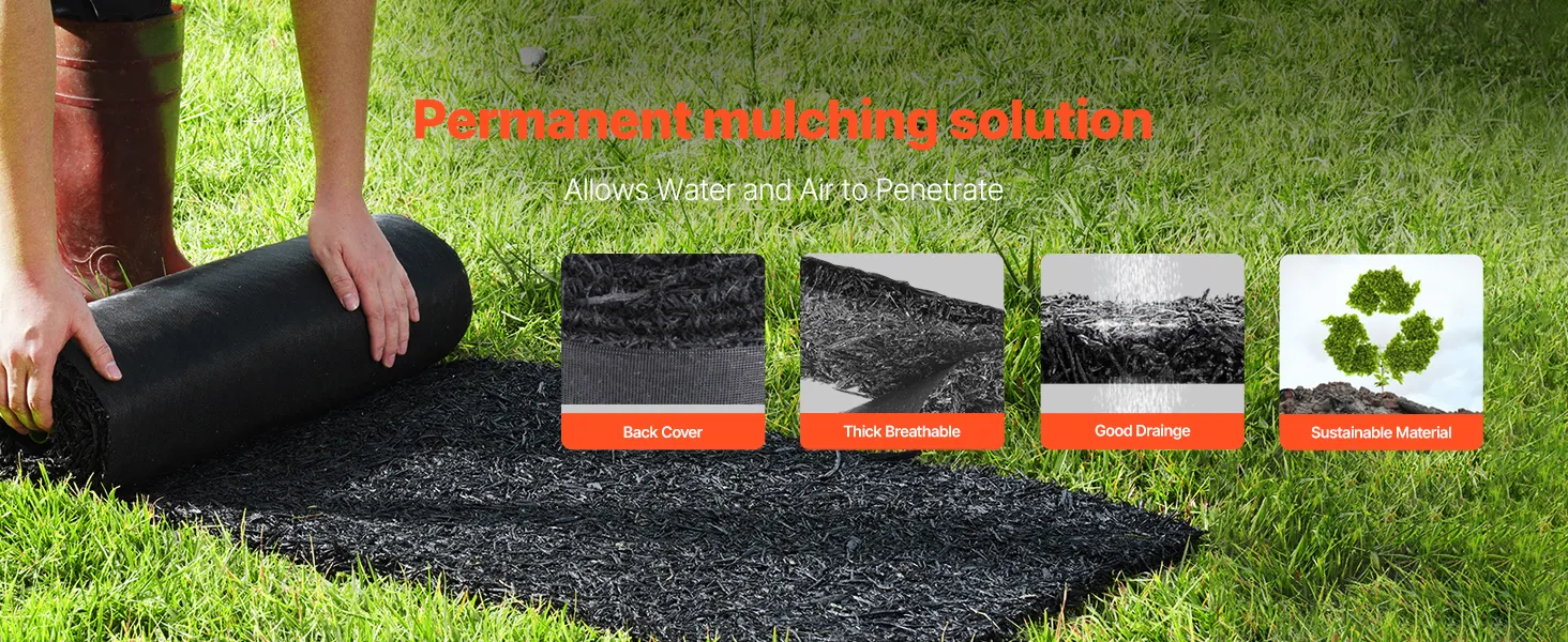 Deze rubberen mulchmat voorkomt onkruidgroei, laat water en voedingsstoffen door en houdt de grond los. Het zorgt ook voor afscheiding tussen bloemperken en gazons, verbetert de esthetiek en voorkomt moddervorming op regenachtige dagen. Eenvoudig te installeren, te snijden en op te bergen.