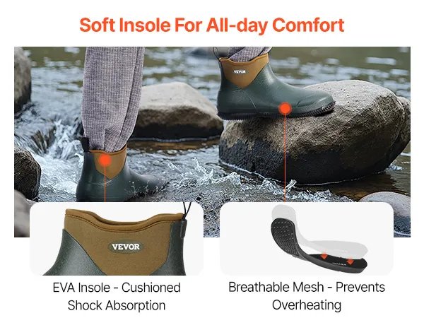 Rubber boots are made from high-quality rubber, offering excellent resistance to wet conditions and breathability, keeping you dry and comfortable during outdoor activities. The EVA insole provides a comfortable fit, while the lightweight design allows you to easily tackle various situations.