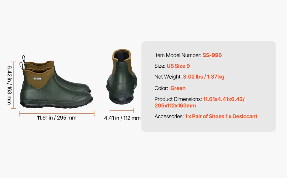 Verschillende maten beschikbaar: Deze rubberlaarzen zijn verkrijgbaar in de maten 9 tot en met 13, zodat ze aan verschillende behoeften voldoen. Raadpleeg de maattabel zorgvuldig voordat u de juiste maat kiest, zodat u zeker weet dat het kledingstuk comfortabel zit.