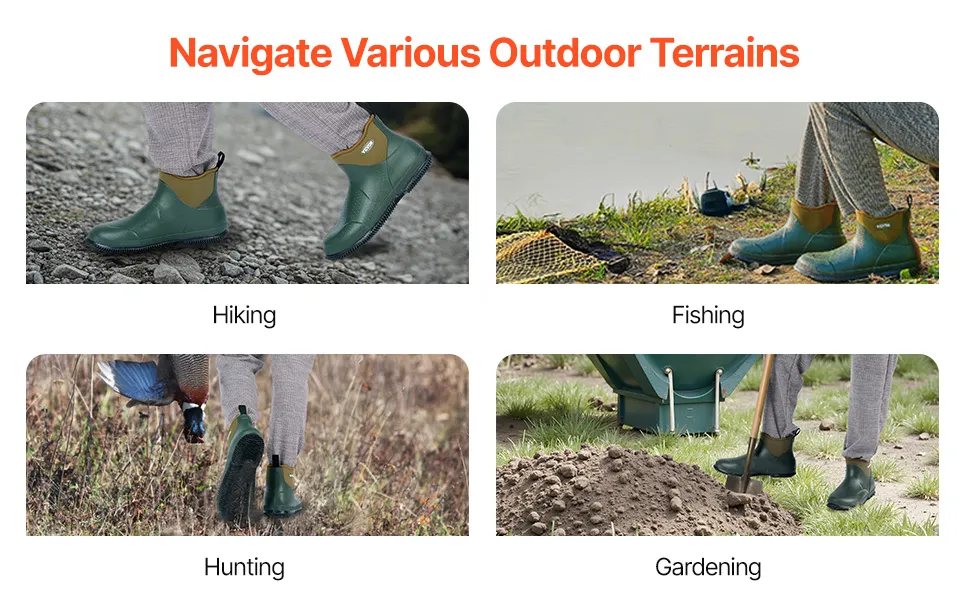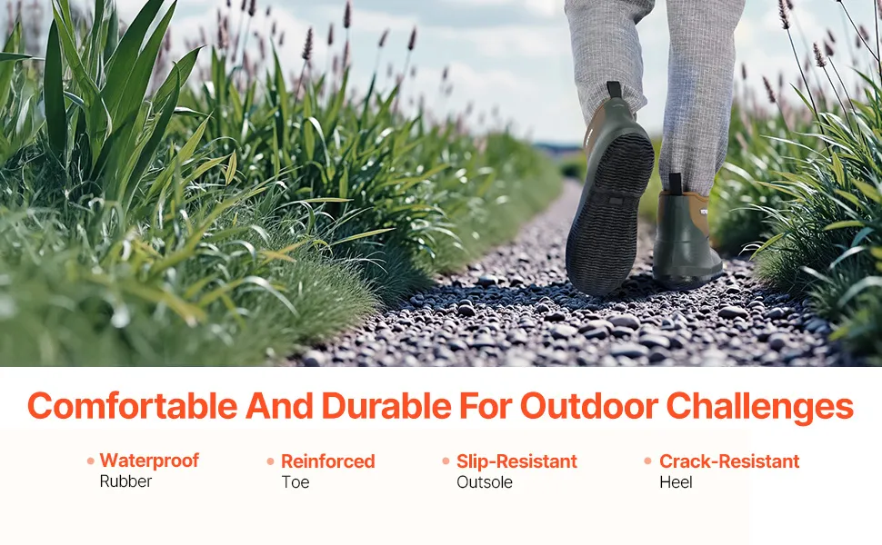 Deze buitenschoenen zijn gemaakt van duurzaam rubber en hebben een antislipzool, een verstevigde neus en een scheurbestendige hak. Hierdoor kunt u moeiteloos de uitdagingen van het buitenleven aan en geniet u tegelijkertijd van een comfortabel en duurzaam gevoel.