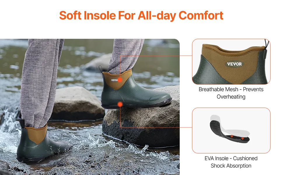 Rubberlaarzen zijn gemaakt van hoogwaardig rubber en zijn uitstekend bestand tegen vocht en ademend. Zo blijft u droog en comfortabel tijdens buitenactiviteiten. De EVA-binnenzool zorgt voor een comfortabele pasvorm, terwijl het lichtgewicht ontwerp ervoor zorgt dat u de schoenen in verschillende situaties gemakkelijk aankunt.
