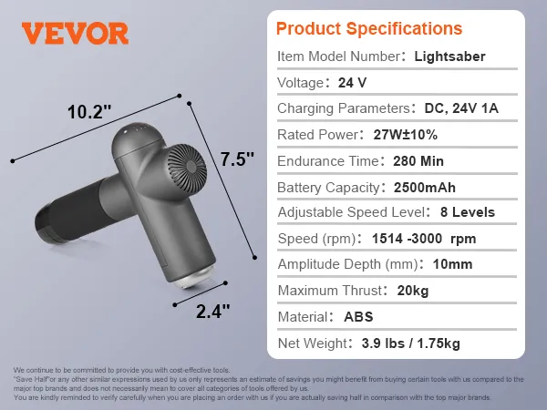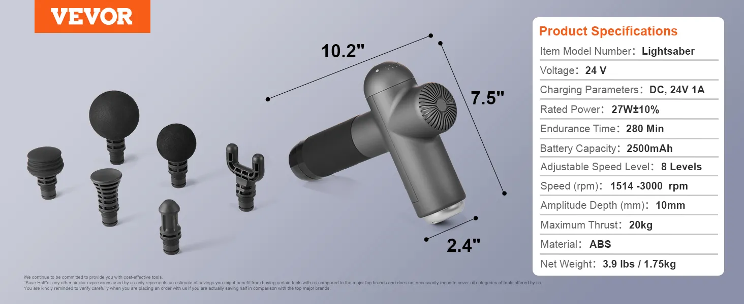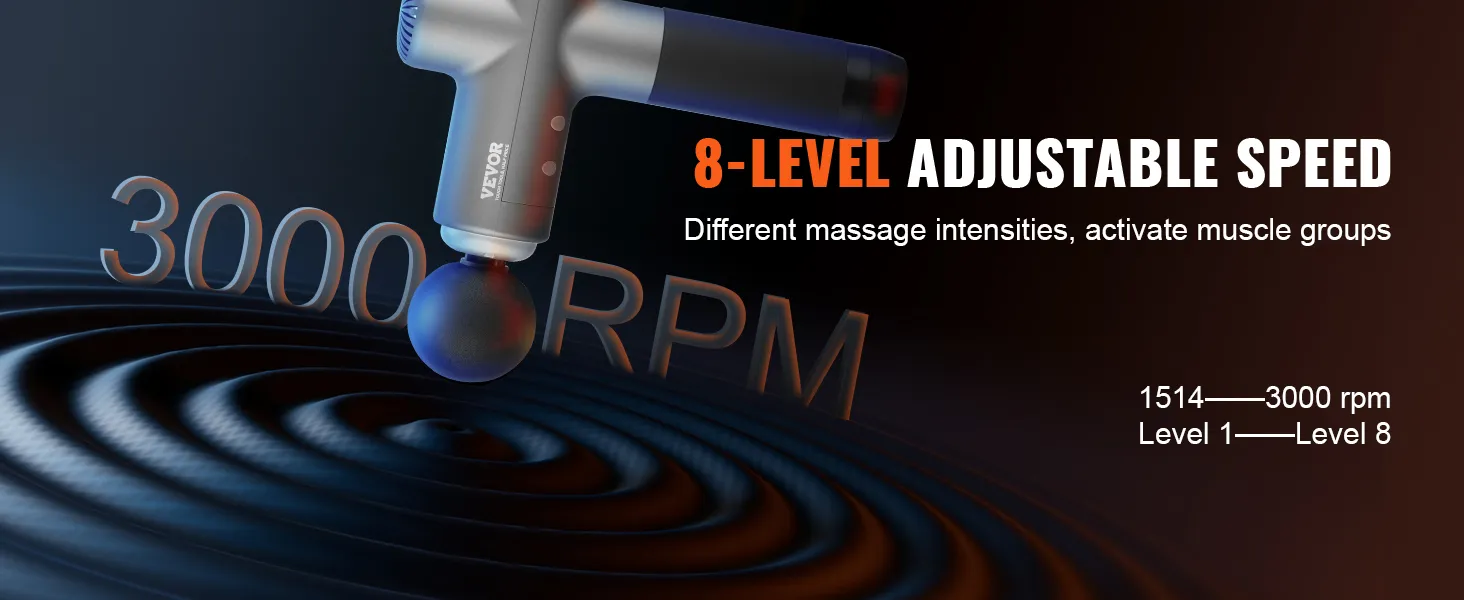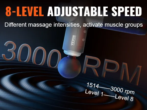 Customizable 8-Speed Settings: Tailor your massage experience with 8 speed levels and 6 interchangeable massage heads. With adjustable speeds ranging from 1514rpm to 3000rpm, VEVOR percussion muscle massage gun will meet your needs for both routine muscle care and deep post-exercise massage.