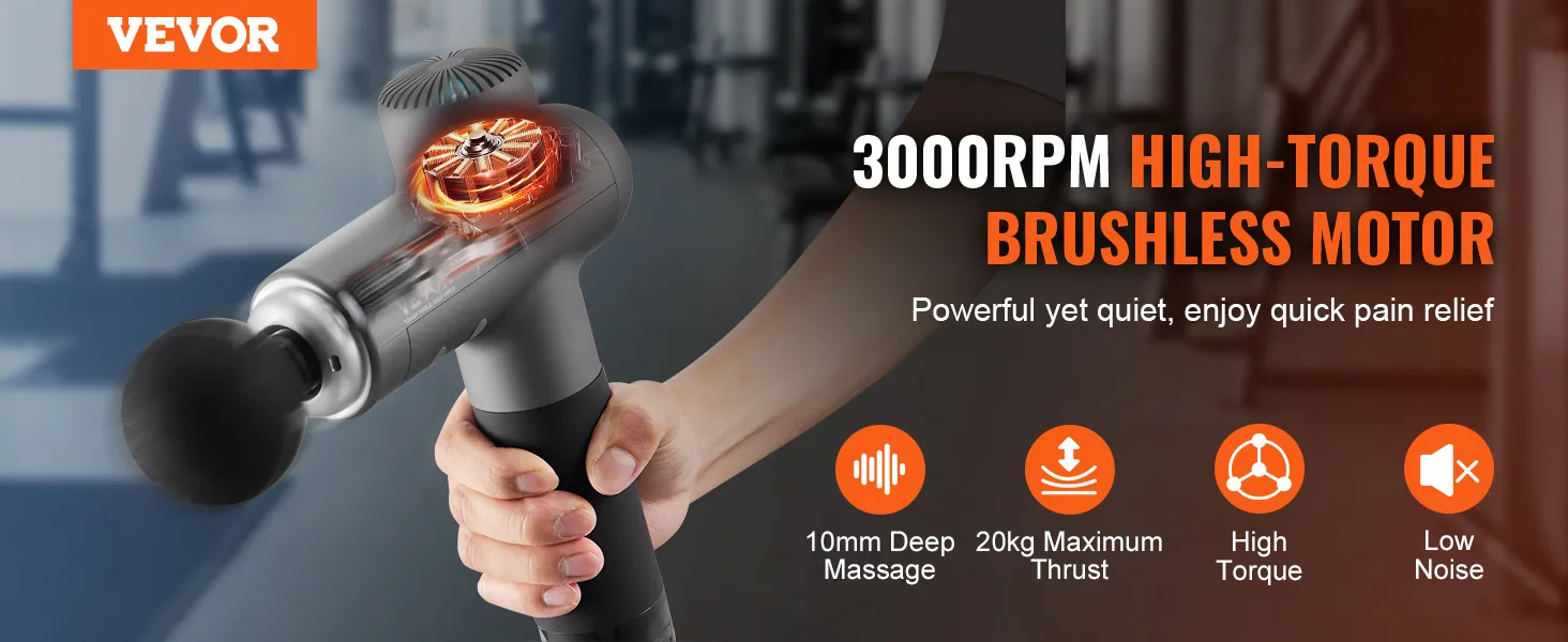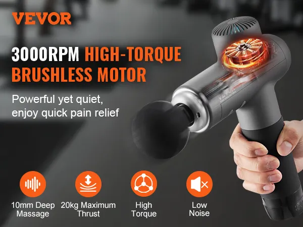 Powerful Yet Quiet: Experience the strength of VEVOR's high-torque brushless motor, delivering robust thrust to relieve muscle soreness with minimal noise. With 10mm amplitude depth and 20kg maximum thrust, our massage gun deep tissue effectively targets deep muscle fatigue and pain, restoring your body's vitality.
