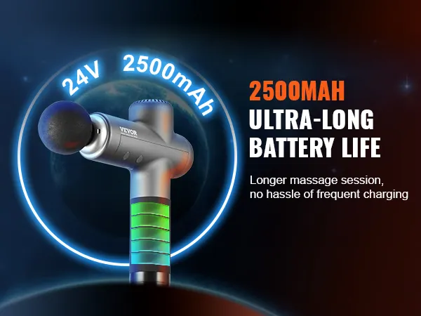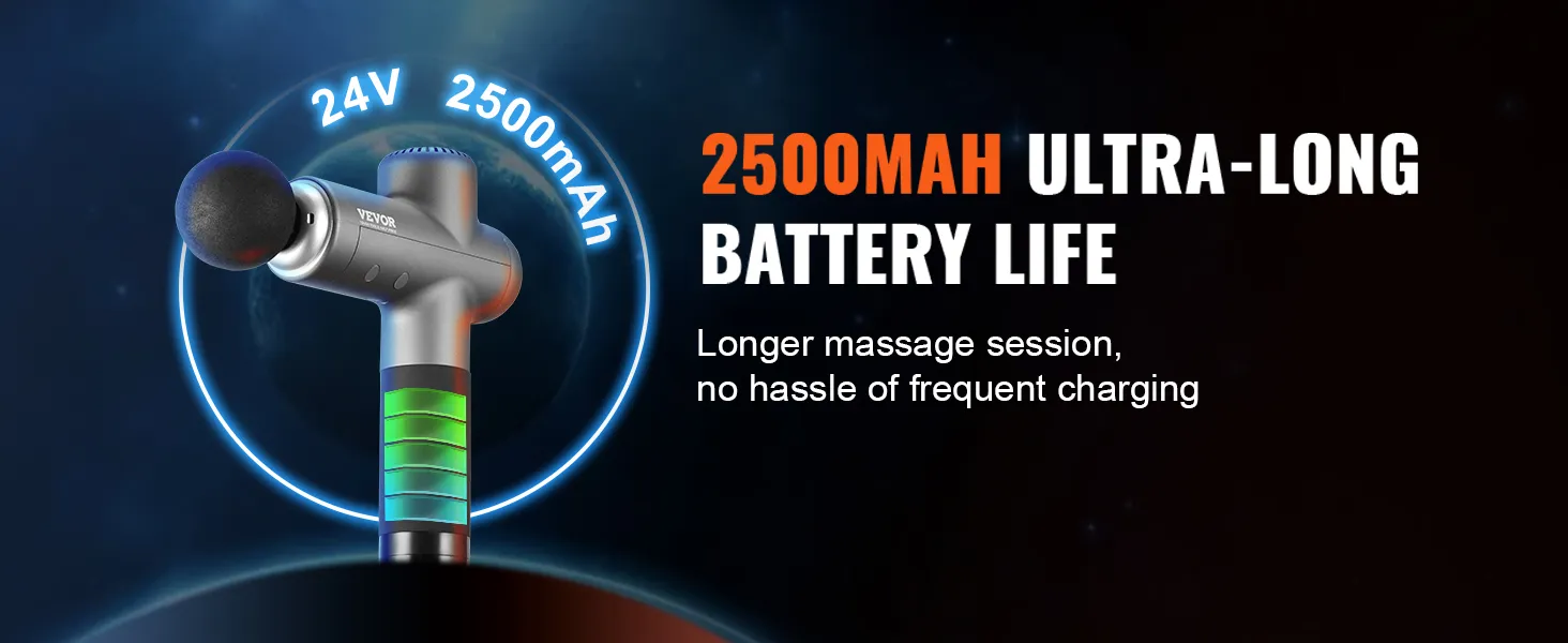 Equipped with 24V 2500mAh high-capacity batteries, this handheld massage gun ensures long-lasting use, eliminating the hassle of frequent recharging. Stay powered up anytime, anywhere, and enjoy continuous support for your health.