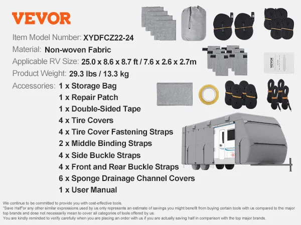 Complete Accessories: The camper cover kit includes 6 sponge drainage covers, 1 storage bag, 1 repair patch, and 1 roll of double-sided tape. The sponge covers prevent snagging on sharp metal edges. If the cover gets cut by branches or sharp edges, simply apply the repair patch with our double-sided tape. The cover can be easily folded and stored in the bag when not in use. Our RV covers for travel trailers also feature "FRONT" and "END" labels for easy identification.