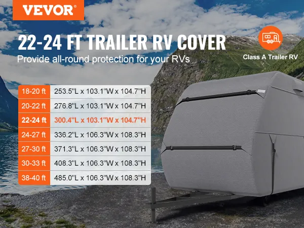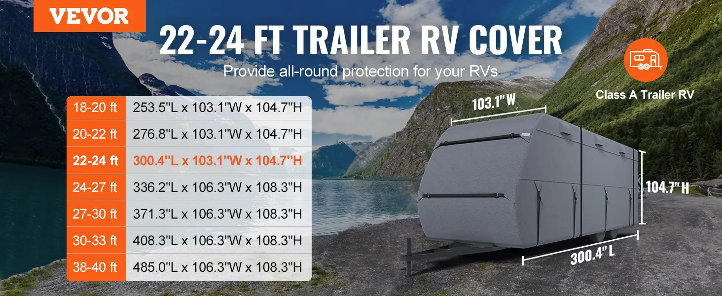 Fit 22-24 ft RVs: This travel trailer cover measures 300.4"L x 103.1"W x 104.7"H, providing a perfect fit for 22'-24' Class-A trailers. The set also includes 4 tire covers. For proper installation, please measure your RV accurately, including the bumper, ladder, and spare tire (excluding hitch). We provide a variety of sizes to ensure the perfect fit for your RV.