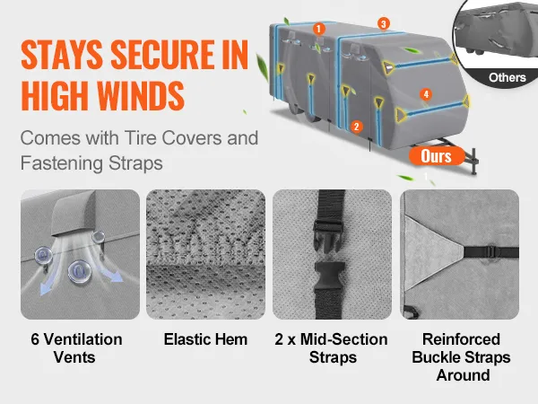 Windproof Fit: The bottom edge of the trailer cover is made with elastic bands. Comprehensive straps and ropes are provided: 2 middle binding straps, 4 side buckle straps, 4 front and rear buckle straps, and 4 tire cover fastening straps. This design allows the cover to hug the contours of your RV, maintaining its shape and enhancing wind resistance to prevent tearing or blowing off. Two sides of the cover are equipped with 3 ventilation ports to avoid bulging.