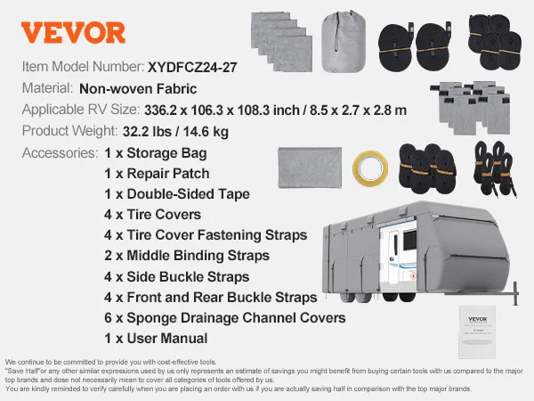 Fit 24-27 ft RVs: This travel trailer cover measures 336.2"L x 106.3"W x 108.3"H, providing a perfect fit for 24'-27' Class-A trailers. The set also includes 4 tire covers. For proper installation, please measure your RV accurately, including the bumper, ladder, and spare tire (excluding hitch). We provide a variety of sizes to ensure the perfect fit for your RV.