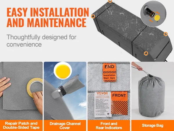 The RV travel trailer cover is equipped with sponge drainage covers, avoiding puncturing for RVs with drainage systems. It features "FRONT" and "END" labels for easy identification during installation. Damage can be quickly repaired with the provided double-sided tape patch.