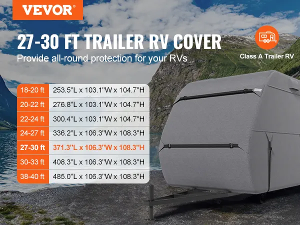 Fit 27-30 ft RVs: This travel trailer cover measures 371.3"L x 106.3"W x 108.3"H, providing a perfect fit for 27'-30' Class-A trailers. The set also includes 4 tire covers. For proper installation, please measure your RV accurately, including the bumper, ladder, and spare tire (excluding hitch). We provide a variety of sizes to ensure the perfect fit for your RV.