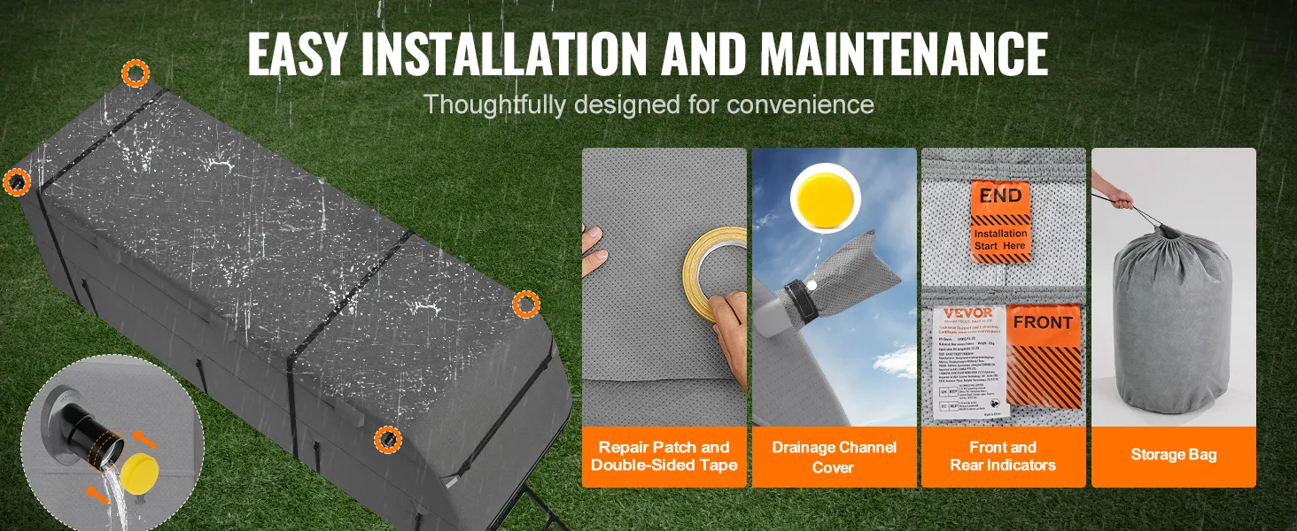 Complete Accessories: The camper cover kit includes 6 sponge drainage covers, 1 storage bag, 1 repair patch, and 1 roll of double-sided tape. The sponge covers prevent snagging on sharp metal edges. If the cover gets cut by branches or sharp edges, simply apply the repair patch with our double-sided tape. The cover can be easily folded and stored in the bag when not in use. Our RV covers for travel trailers also feature "FRONT" and "END" labels for easy identification.