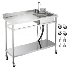 VEVOR RVS spoelbak (120 x 50 x 94 cm), enkele kom met kraan en plank, keukengootsteen voor garage, restaurant, wasruimte, buitenwasbak met werkblad (links)