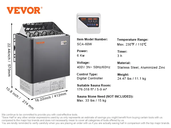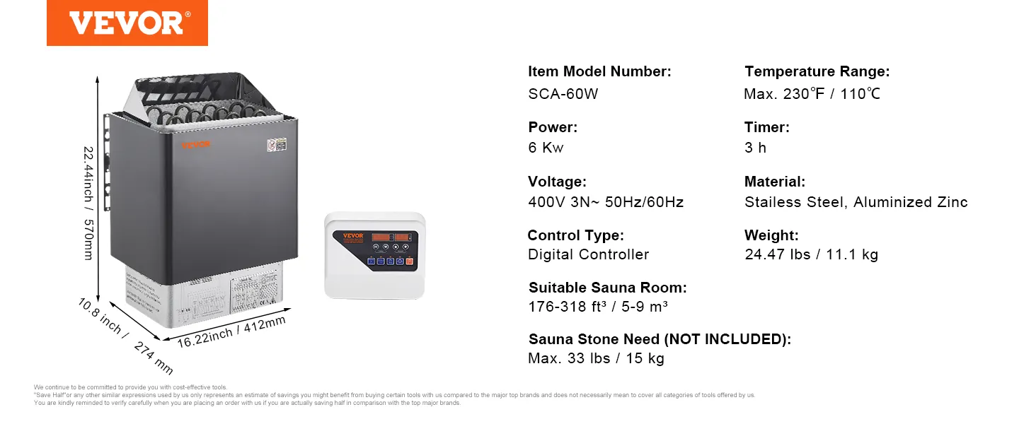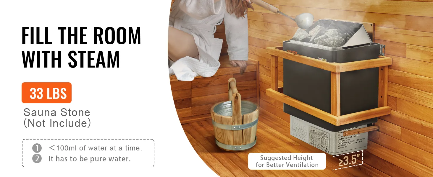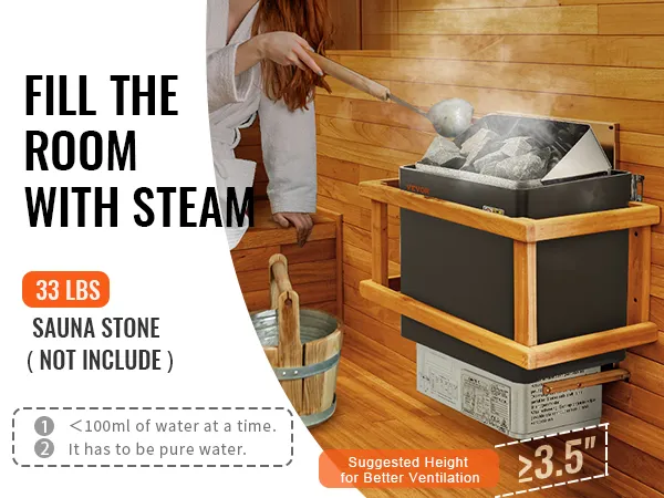 Fast Heating: This product is 400V, a special voltage. The site conditions need to be evaluated before use. Power: 6.2KW; Suitable Sauna Room: 177 -318 ft³ cu.ft /5-9m³; Dimension: 16.22 x 10.8 x 22.44 in / 412 x 274 x 570 mm. Sauna Stones Need: 33 lbs / 15 kg. Note: Sauna stones are NOT INCLUDED. The ample stone capacity allows the stones to absorb and store heat, ensuring effective heat retention and dispersion