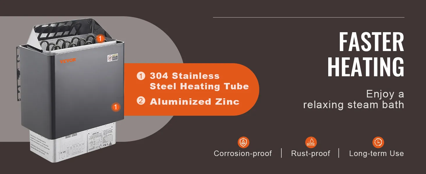 Built to Last Construction: The sauna heater features an aluminized zinc shell, ensuring high resistance to corrosion and a long lifespan for the heater, even in high humidity environments. The 304 stainless steel heating element ensures quick and even heat distribution, providing a comfortable sauna experience in a short amount of time
