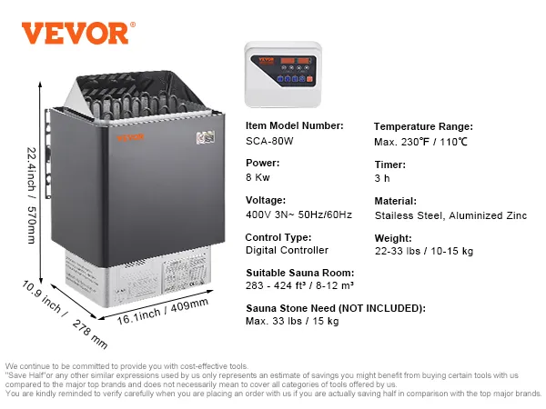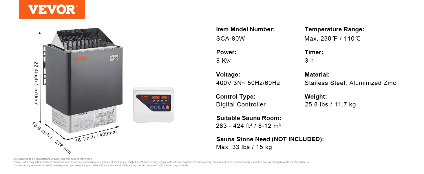 Fast Heating: This product is 400V, a special voltage. The site conditions need to be evaluated before use. Power: 8KW; Suitable Sauna Room: 283 -424 ft³ / 8-12 m³; Dimension: 16.1 x 10.9 x 22.44 in / 409 x 278 x 570 mm. Sauna Stones Need: 33 lbs / 15 kg. Note: Sauna stones are NOT INCLUDED. The ample stone capacity allows the stones to absorb and store heat, ensuring effective heat retention and dispersion