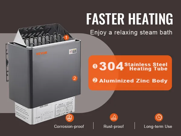 Built to Last Construction: The sauna heater features an aluminized zinc shell, ensuring high resistance to corrosion and a long lifespan for the heater, even in high humidity environments. The 304 stainless steel heating element ensures quick and even heat distribution, providing a comfortable sauna experience in a short amount of time