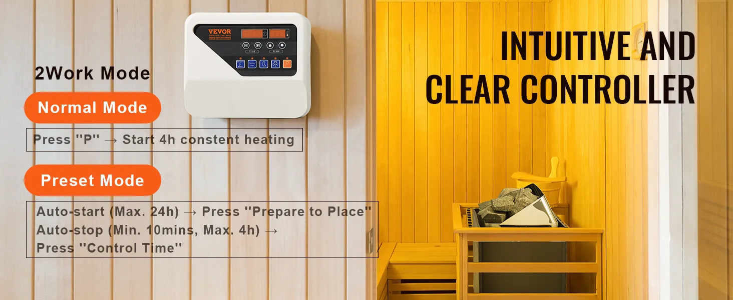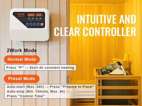 External Controller: Our home sauna heater offers utmost convenience with an external controller mounted outside the sauna, featuring a clear display and user-friendly interface. Adjusting temperature, time, and other settings is a breeze with the intuitive controller. You have the option to select from two modes: Normal mode for consistent heating up to 4 hours, or Preset mode for automatic start and stop functionality