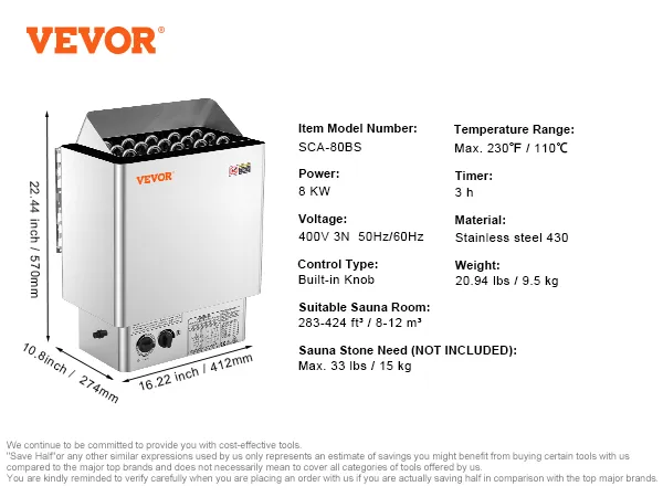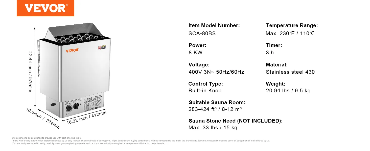 Fast Heating: This product is 400V, a special voltage. The site conditions need to be evaluated before use. Power: 8KW; Suitable Sauna Room: 283-424 ft³ / 8-12 m³; Dimension: 16.14 x 10.9 x 22.64 in / 410 x 278 x 575 mm. Sauna Stones Need: 33 lbs / 15 kg. Note: Sauna stones are NOT INCLUDED. The ample stone capacity allows the stones to absorb and store heat, ensuring effective heat retention and dispersion