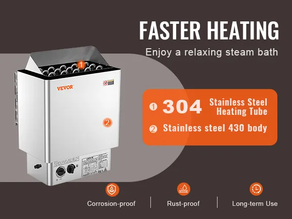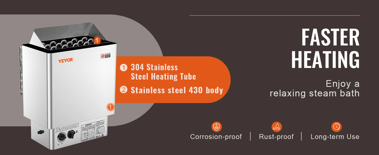 Built to Last Construction: The sauna heater features an stainless steel 430 shell, ensuring high resistance to corrosion and a long lifespan for the heater, even in high humidity environments. The 304 stainless steel heating element ensures quick and even heat distribution, providing a comfortable sauna experience in a short amount of time